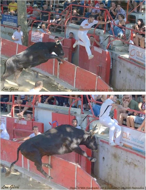 Le taureau sort énerver dans le même état d'esprit que sont les raseteurs. Charrade est à l’affût Le taureau effectue de nombreux sauts derrière l'homme (4 fois derrière Charrade, 1 fois derrière Garcia) et enchaîne les sauts sur les autres. La bataille pour la victoire fait faire un peu n'importe quoi aux raseteurs, ce qui oblige le président de course à les rappeler à l’ordre et à faire une pause afin de calmer les esprits. Le taureau continue des actions spectaculaires, et Charrade l'emporte grâce à son deuxième gland devançant Florentin Garcia et Lucas Lopez qui était lâché.